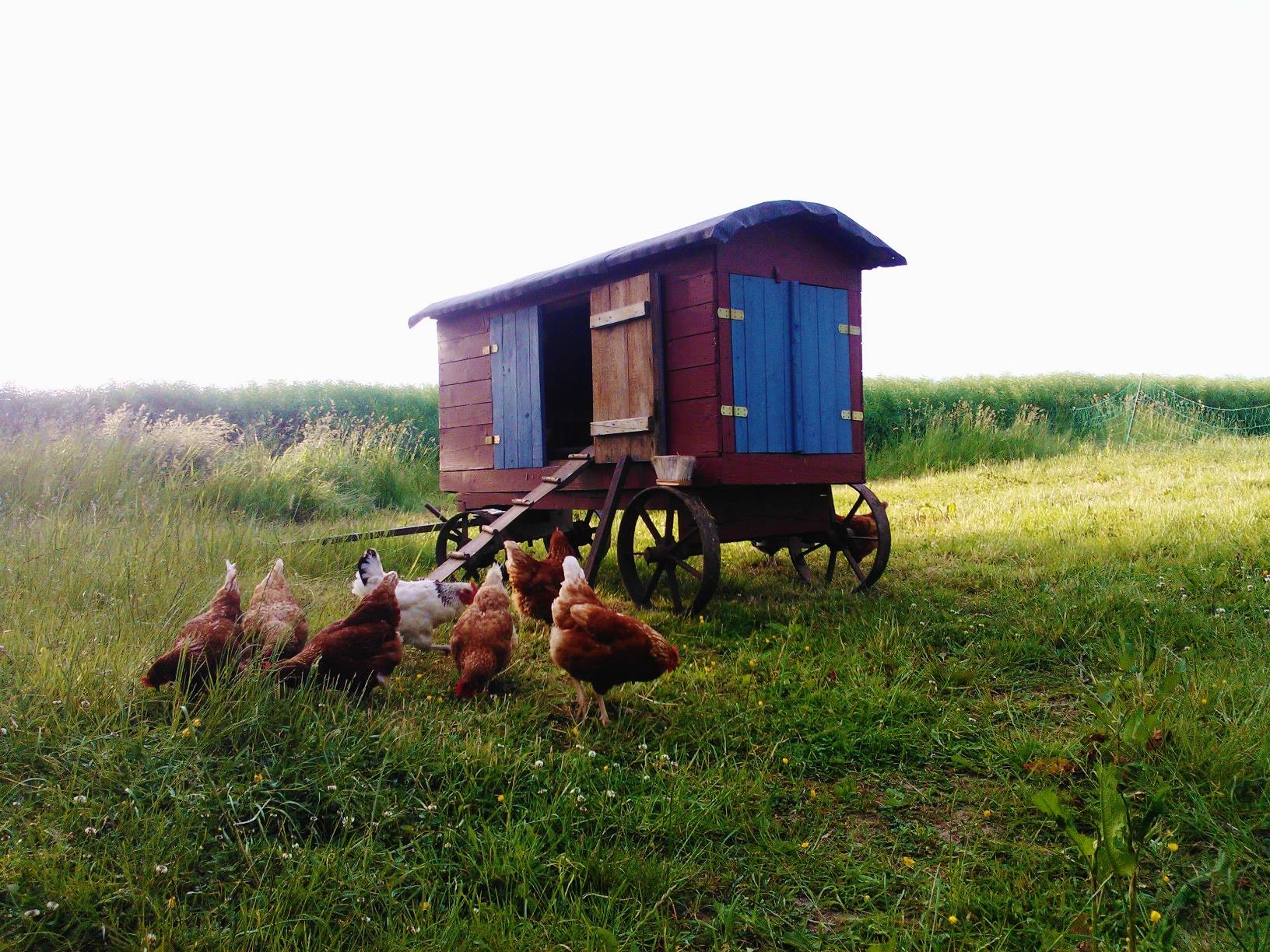 Wir, das sind die 17 Hühner vom Minimarkt. Ihr könnt uns manchmal sehen, wenn wir mit unserem Mobilheim nah genug am Minimarkt campieren. Wir mögen es herumzuziehen - so sehen wir einfach mehr von der Welt. Zusammen mit uns wohnen noch 2 Hähne (Henner und Tjark), von denen wir selbst gar nicht so genau wissen, wozu sie eigentlich nützlich sind. Sie selbst denken auf jeden Fall sie seien ungeheuer wichtig. Da sie sich untereinander aber nie recht einig sein können, wer von ihnen nun der Aller-Wichtigste sei, sieht man sie manchmal um die Wette rennen oder kann ihrem akustischen Wettstreit lauschen. Scheinbar sind Rennen und Krähen wichtige Eigenschaften für Hähne. Wir haben uns daran gewöhnt und tun so, als ob wir finden, sie seien richtig tolle Hechte. Aber das ist natürlich Blödsinn, weil sie einfach nur zwei ganz gewöhnliche Hähne sind. Ab und an können sie aber auch ganz nützlich sein, sie sagen uns nämlich Bescheid wenn sie leckeres Futter gefunden haben. Und natürlich gäbe es ohne diese beiden Super-Hähne keine Küken. Wir finden, unsere Eier sind pures Glück.